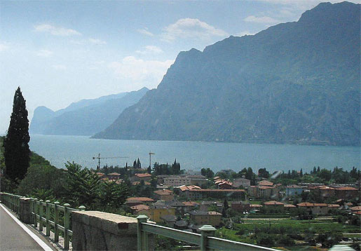 Вдруг справа, между двух покрытых лесом невысоких гор, открывается блестящая гладь голубого, как небо, озера Гарда. Сворачиваем на серпантин боковой дороги и через десять минут победно, как нам казалось, въезжаем в городок Сойано-дель-Гарда.